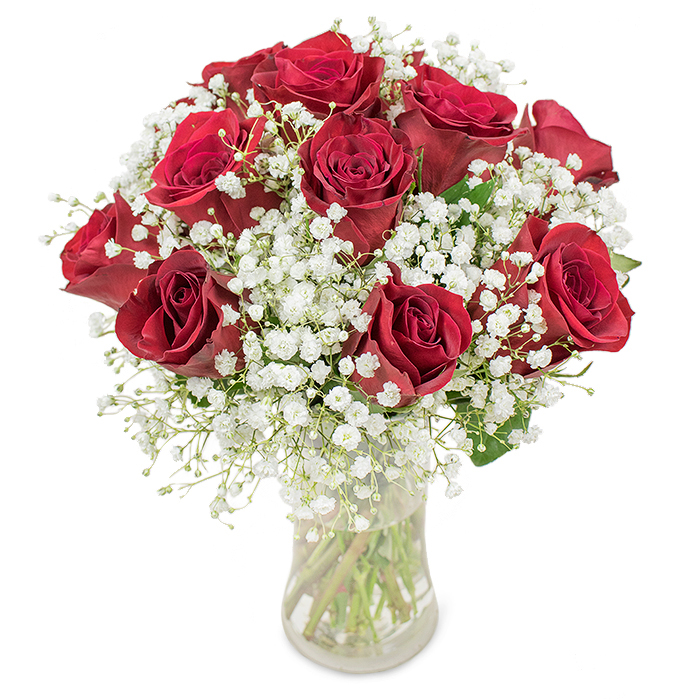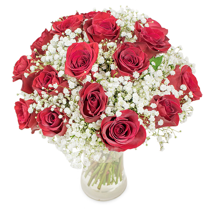 Present your affection with our graceful bouquet featuring vibrant red roses accompanied by lovely white gypsophila. This beautiful arrangement is designed to convey your deepest emotions.