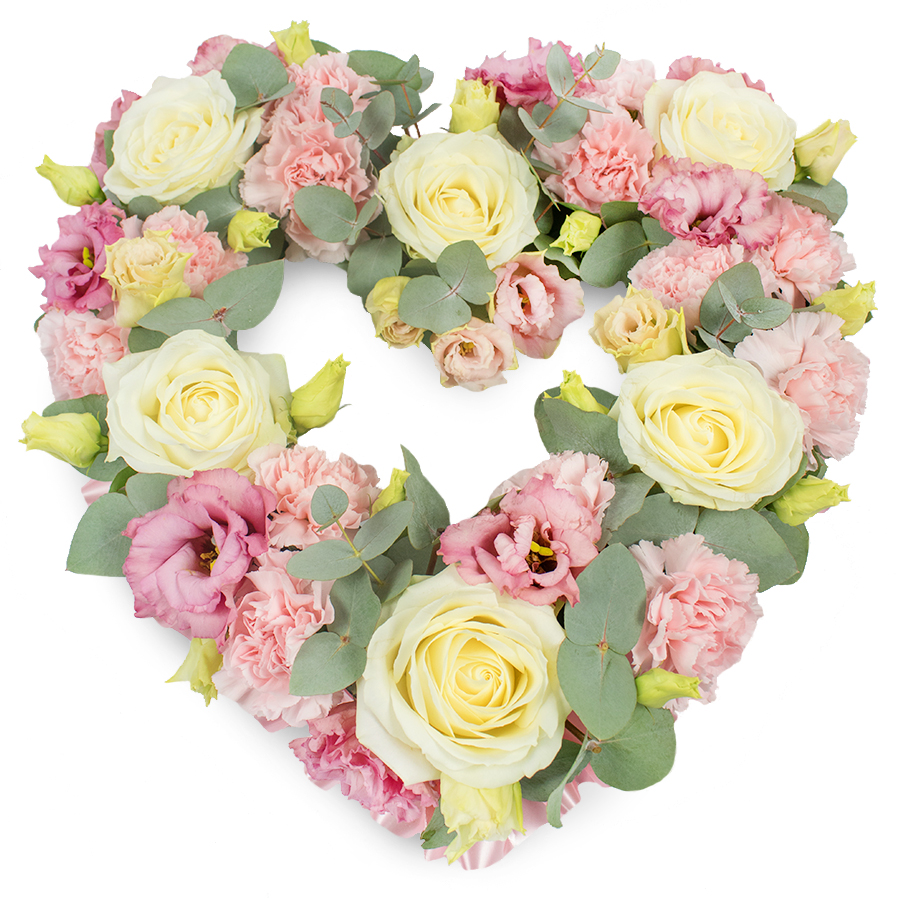 Express your heartfelt sentiments with our Open Heart Tribute bouquet. This beautifully crafted arrangement includes white roses, pink carnations, pink lisianthus, and Eucalyptus leaves, creating a unique and elegant display.